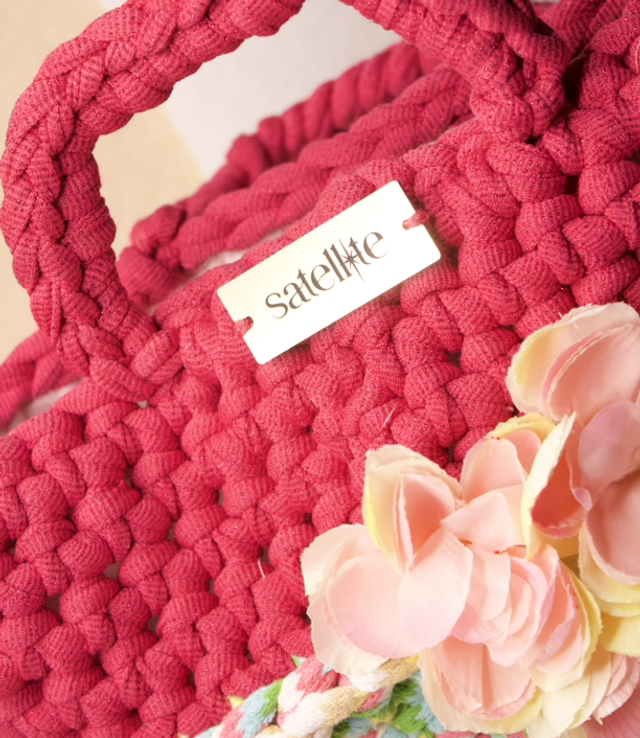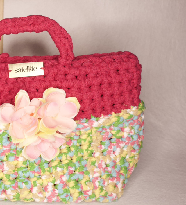 Borsa bicolore foderata con fiore sintetico rosa decorativo. Pezzo unico.