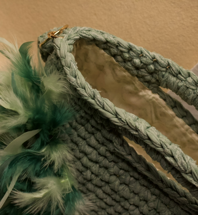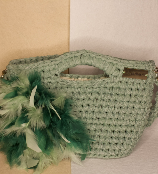 Borsa verde chiaro foderata con piume decorative e rimovibili. Base rigida. Pezzo unico.