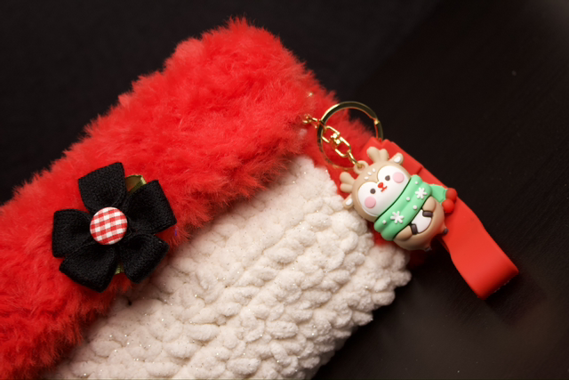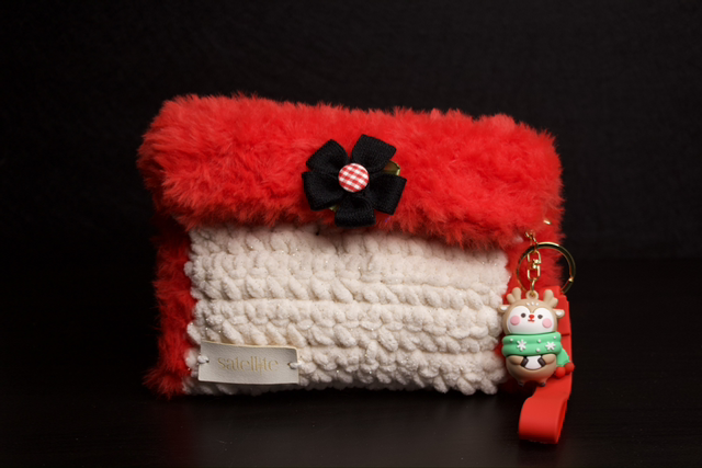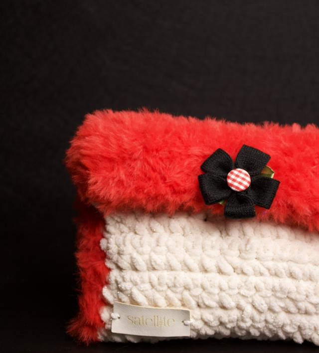 Mini busta in ciniglia bianca. Foderata con tracolla e charm. Misura 19x15 cm.